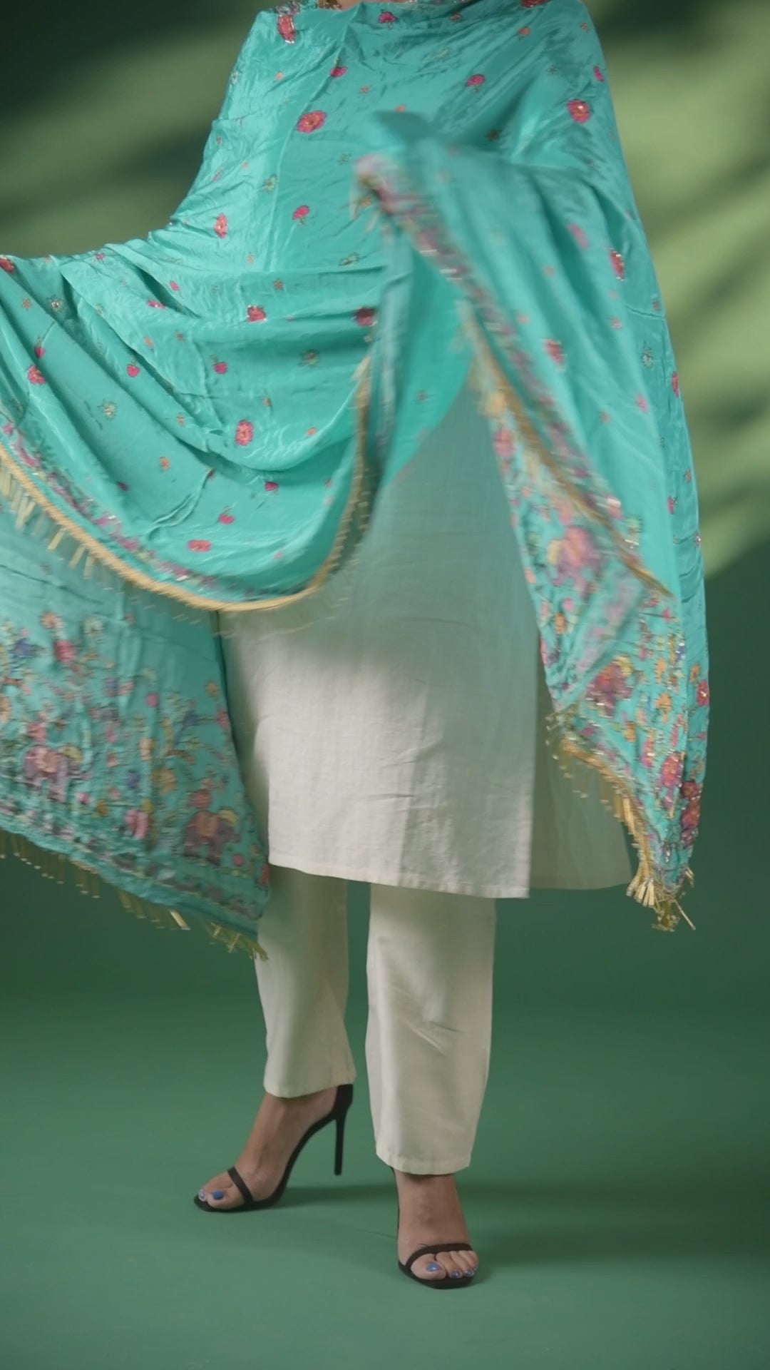 - A beautifully patterned border frames the dupatta in contrasting magenta, teal, and green tones, creating a striking finish.
